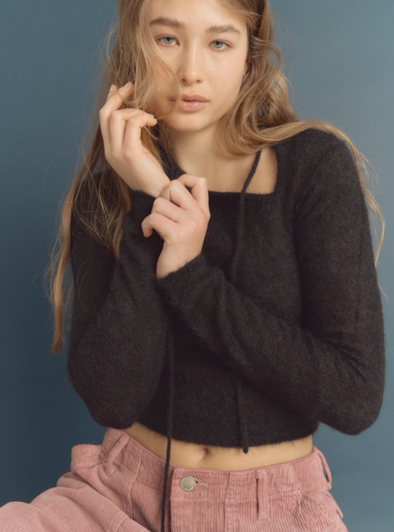 チャイナカラーのロングスリーブニット。軽く柔らかなアルパカ混。