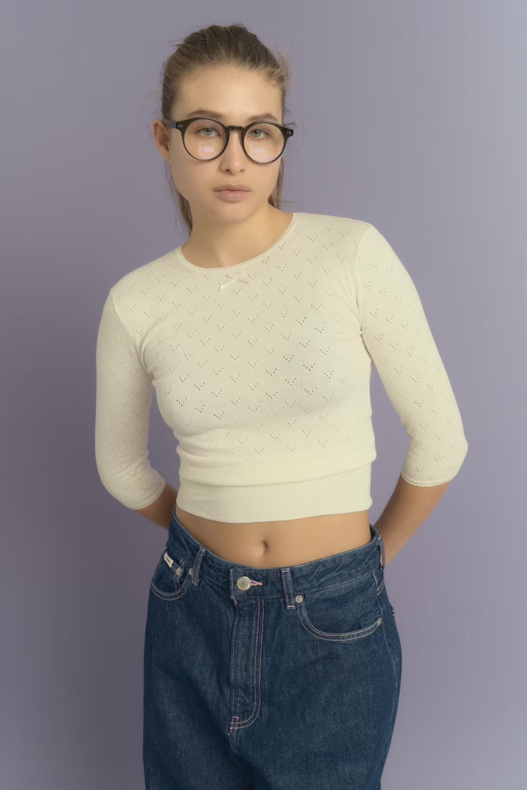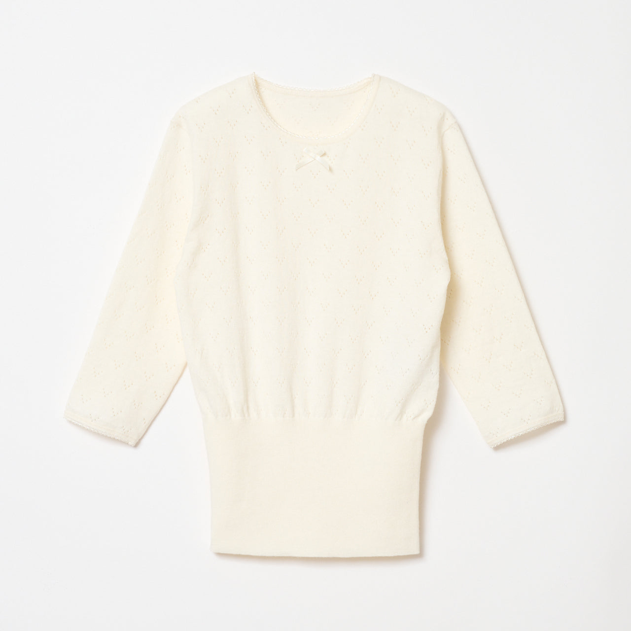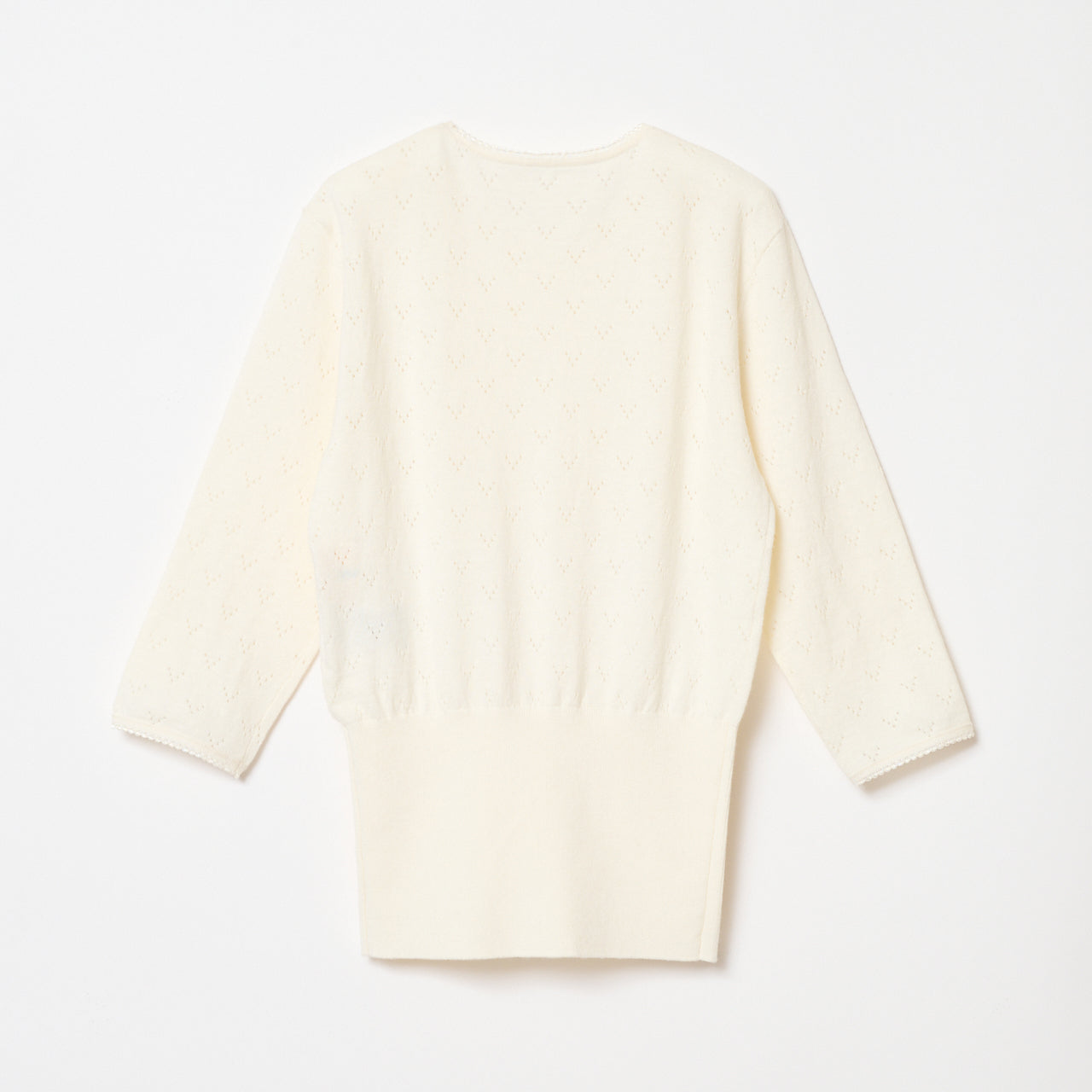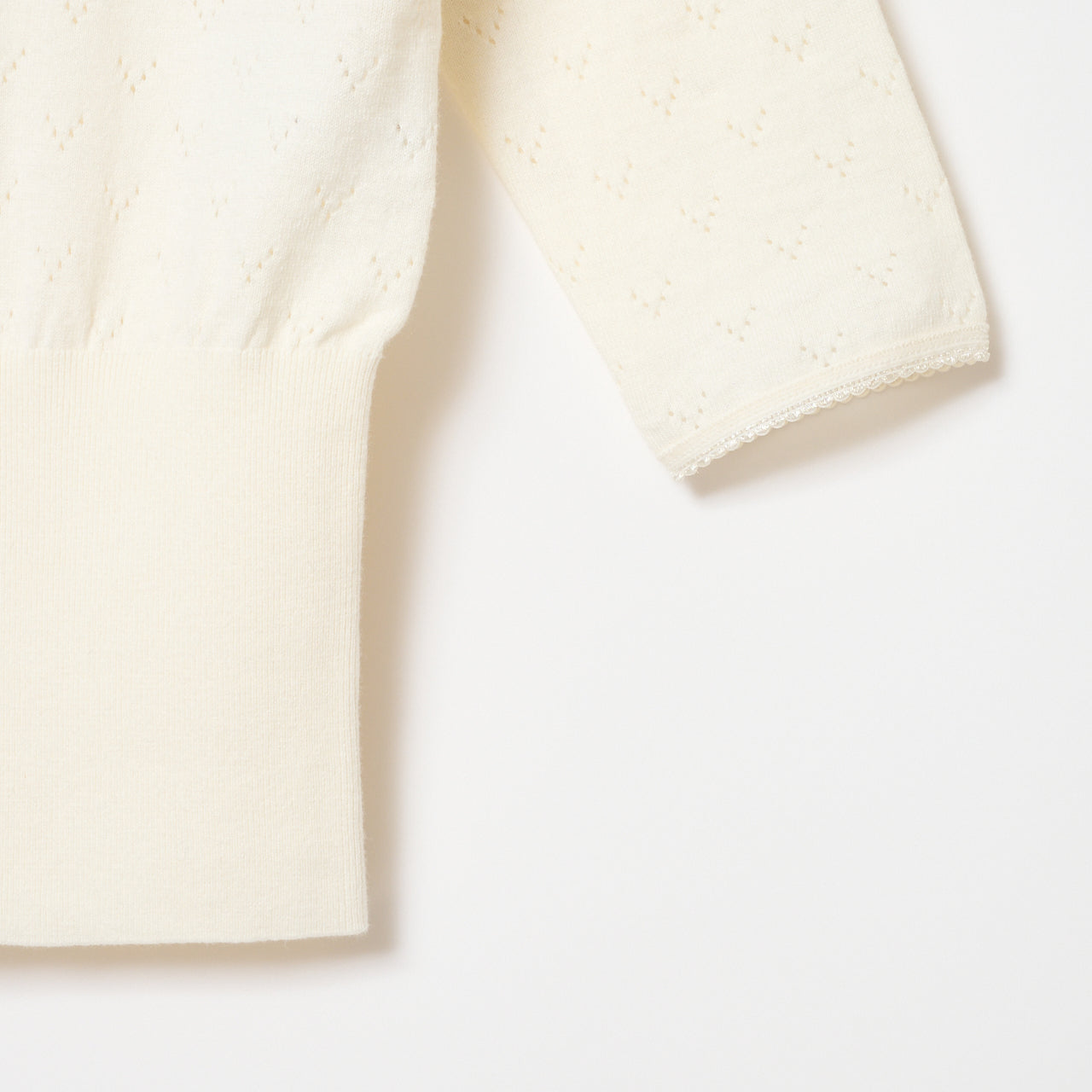 透かし編みを施した五分袖のコットン・カシミアプルオーバーニット。