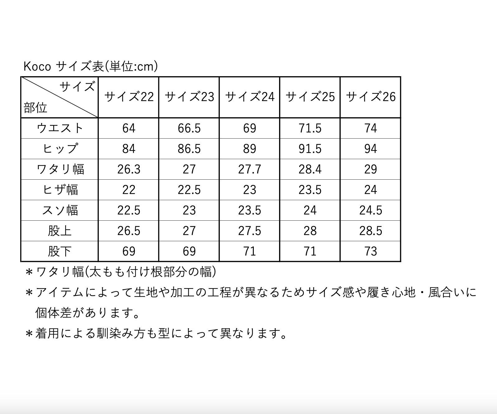 *アイテムによって生地や加工の工程が異なるため、サイズ感や履き心地、風合いに個体差があります。