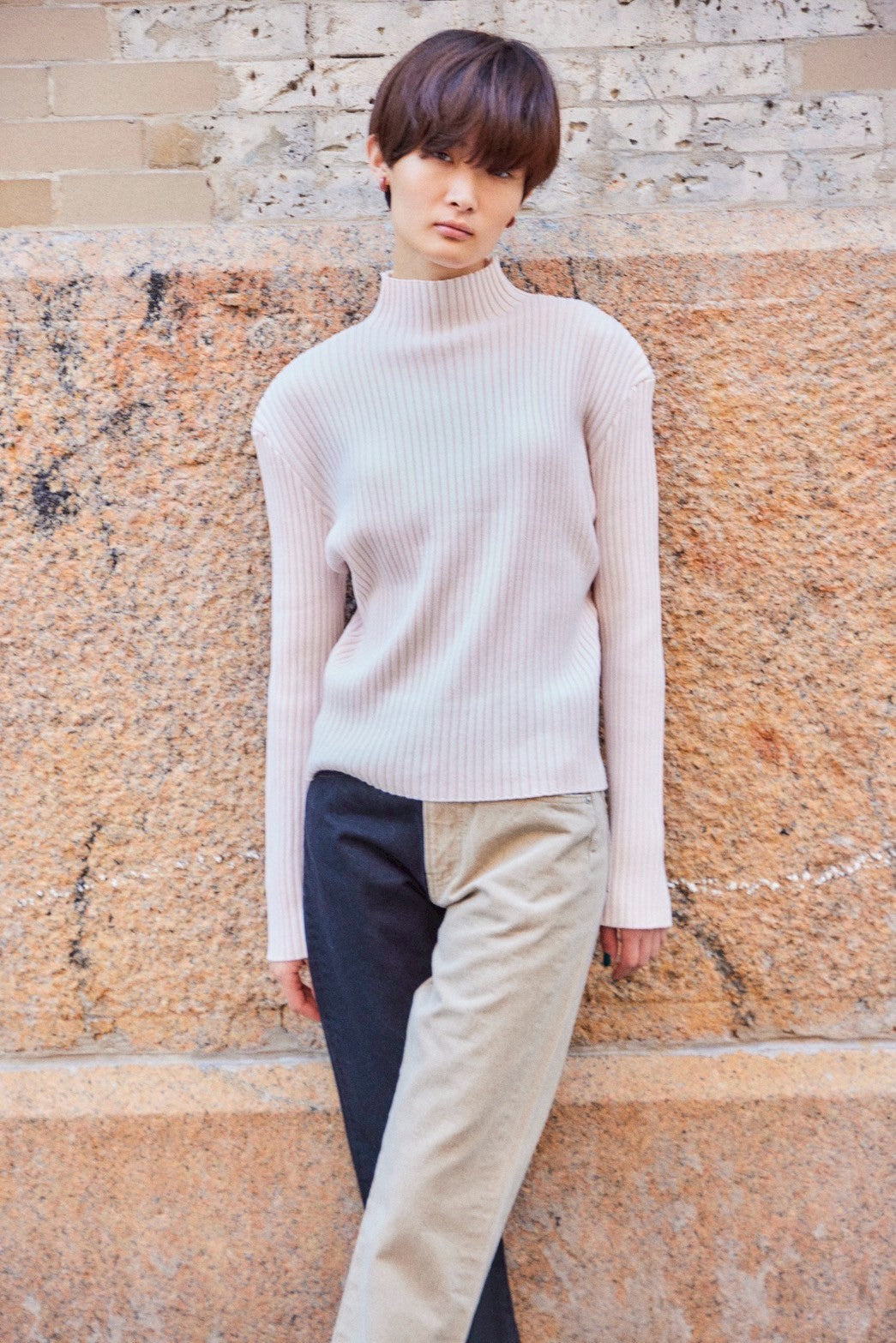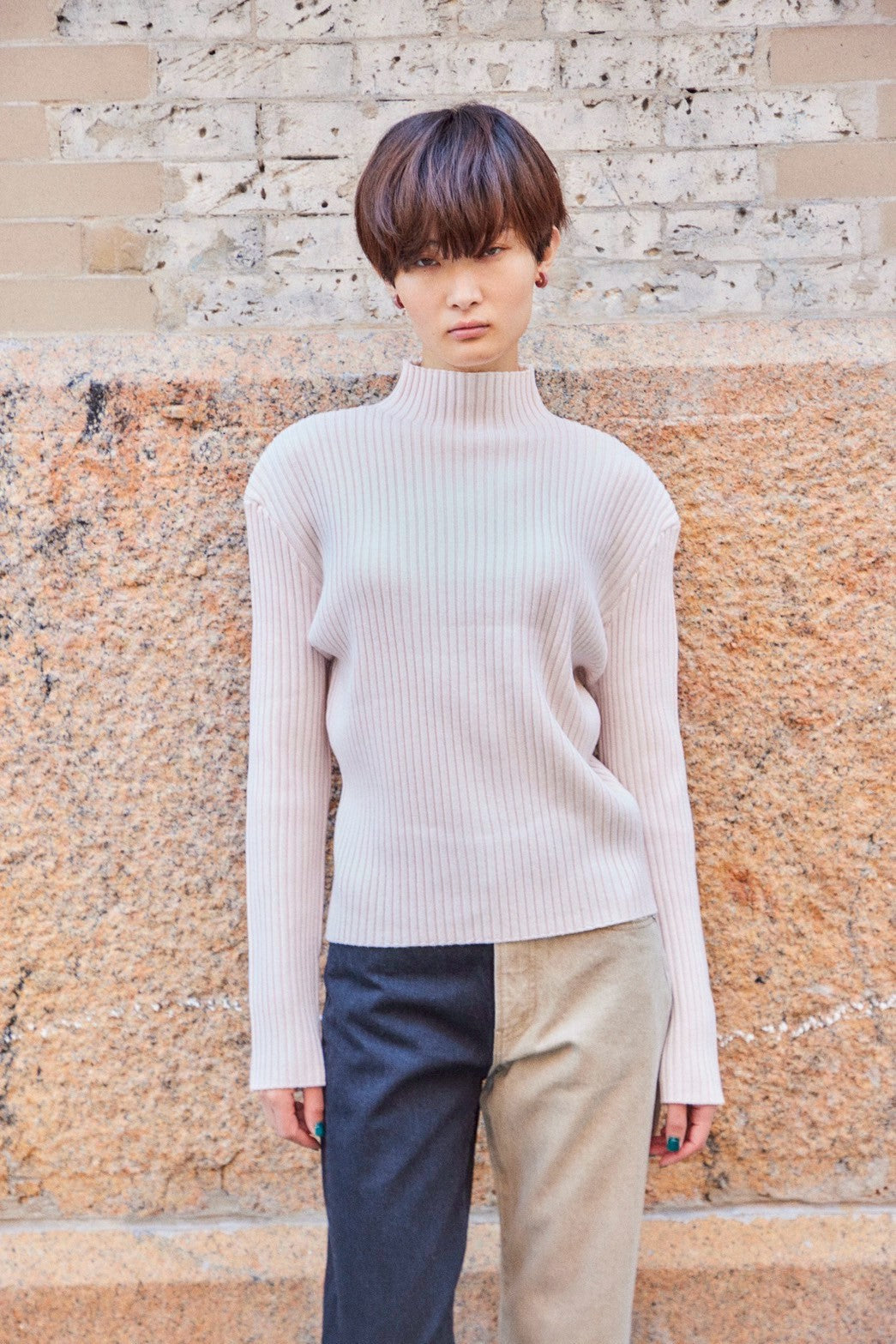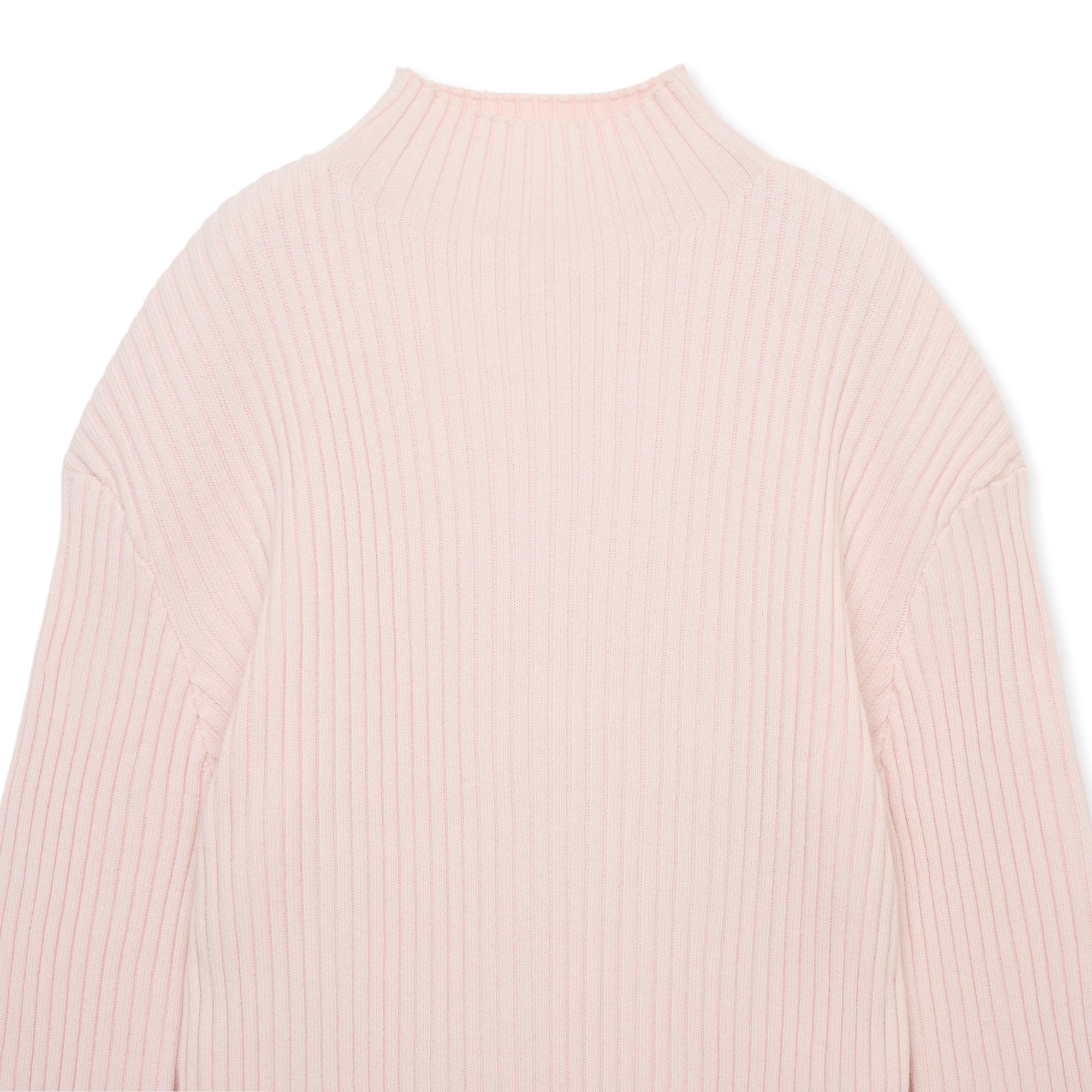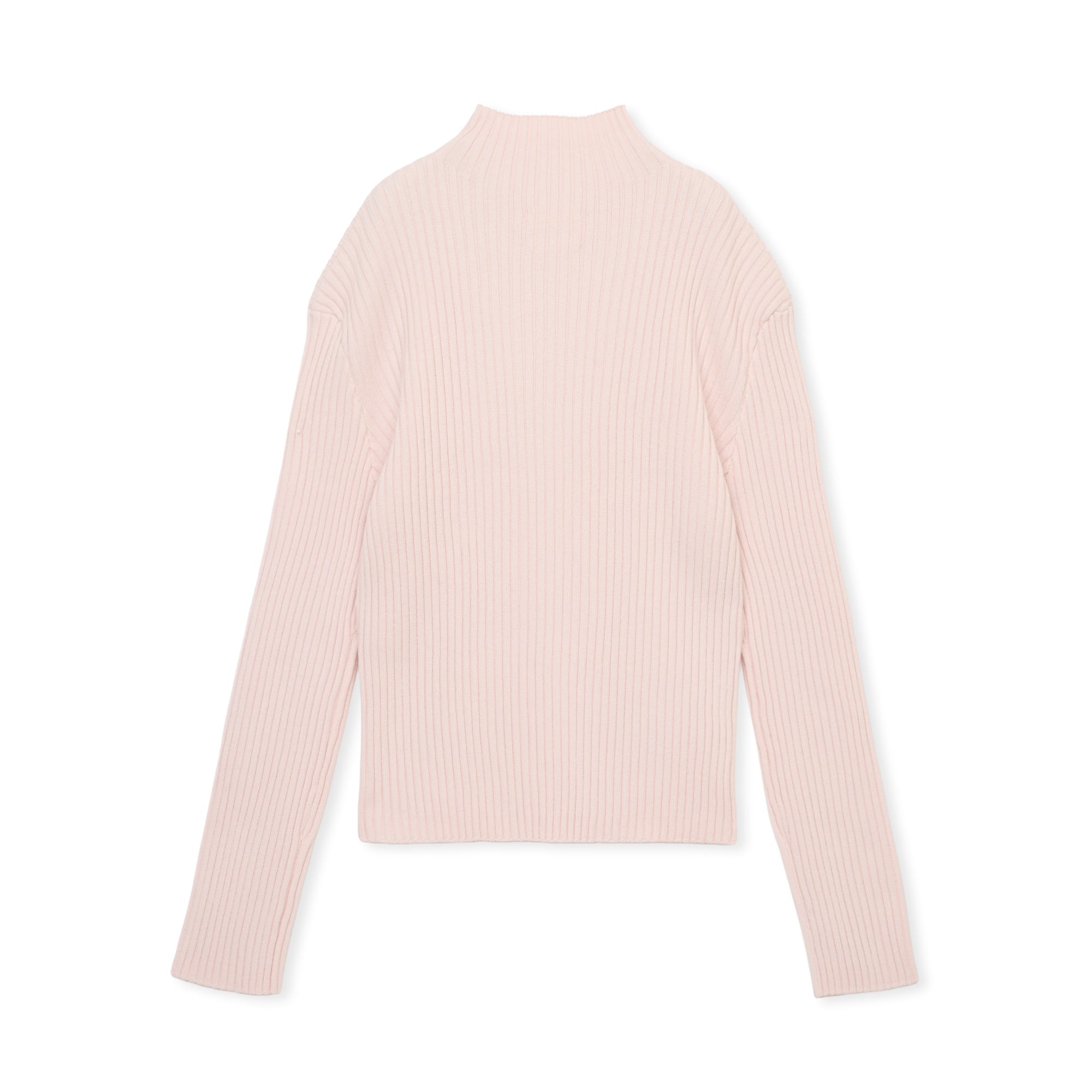ハイネック、ストレートシルエットのプルオーバーリブニット。