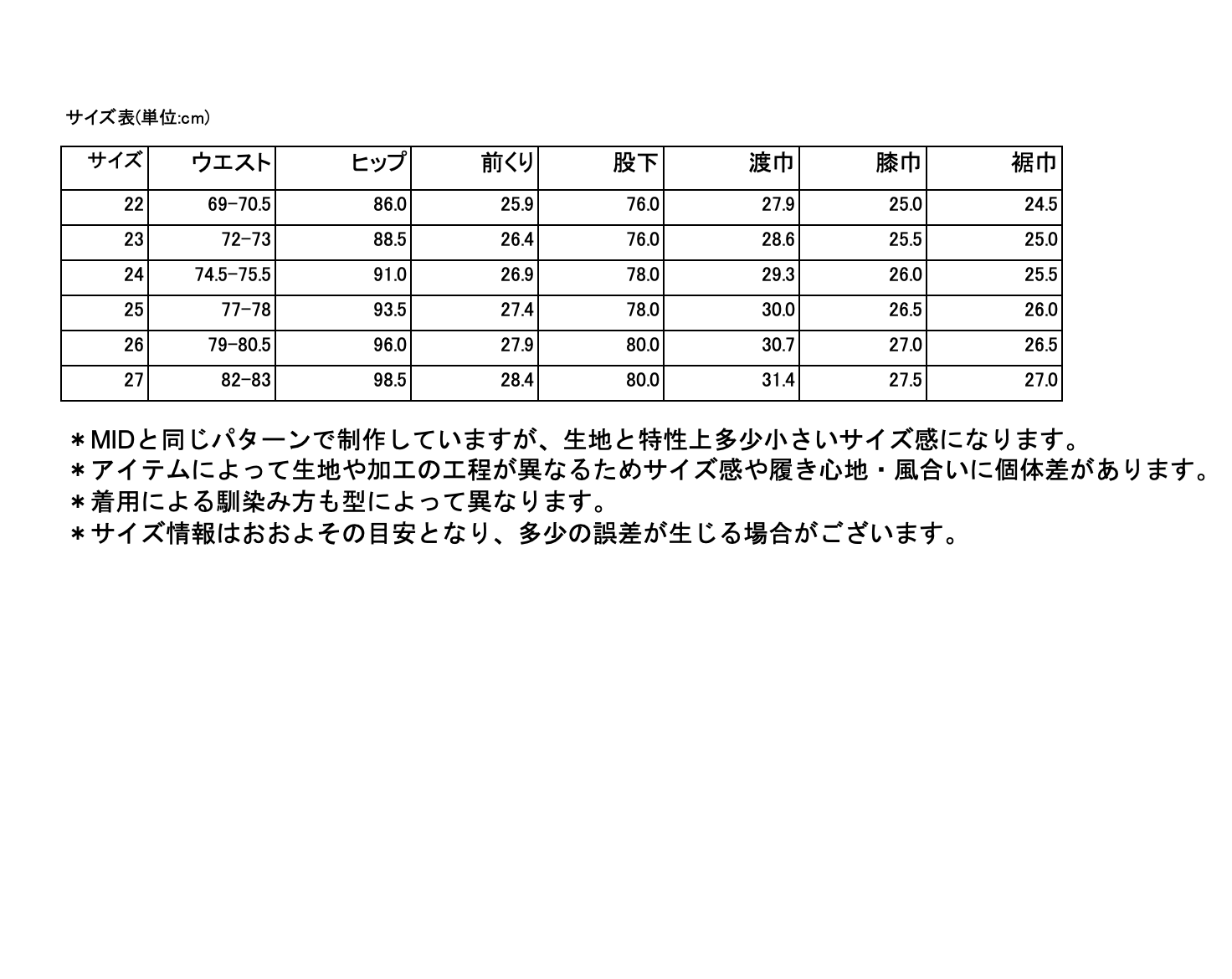 *アイテムによって生地や加工の工程が異なるため、サイズ感や履き心地、風合いに個体差があります。