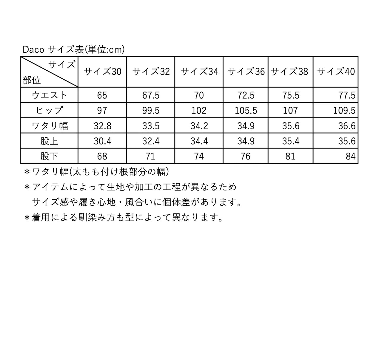 *アイテムによって生地や加工の工程が異なるためサイズ感や履き心地・風合いに個体差があります。