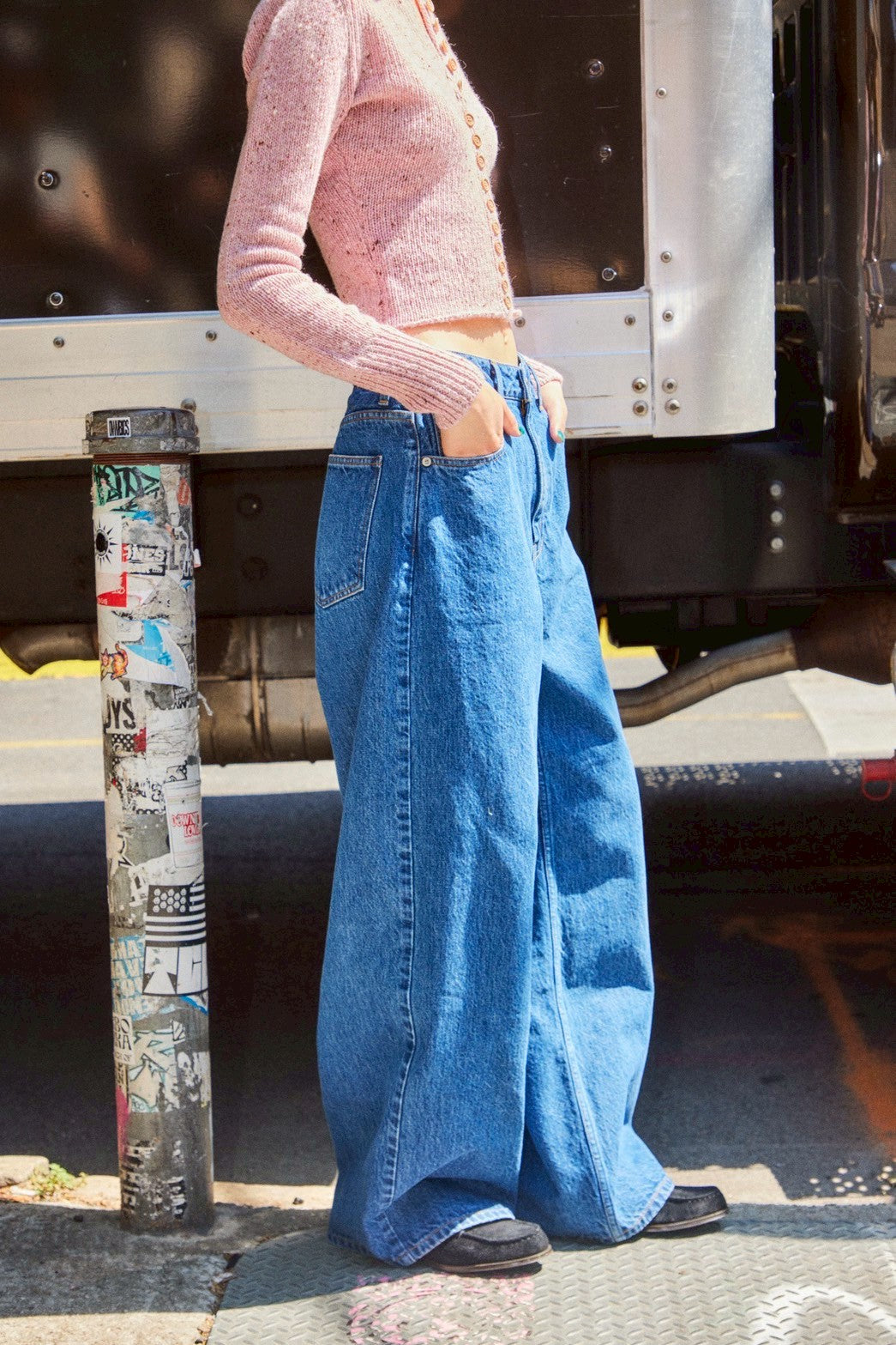 ボリュームのある幅広いシルエットが特徴的なワイドデニムパンツ。