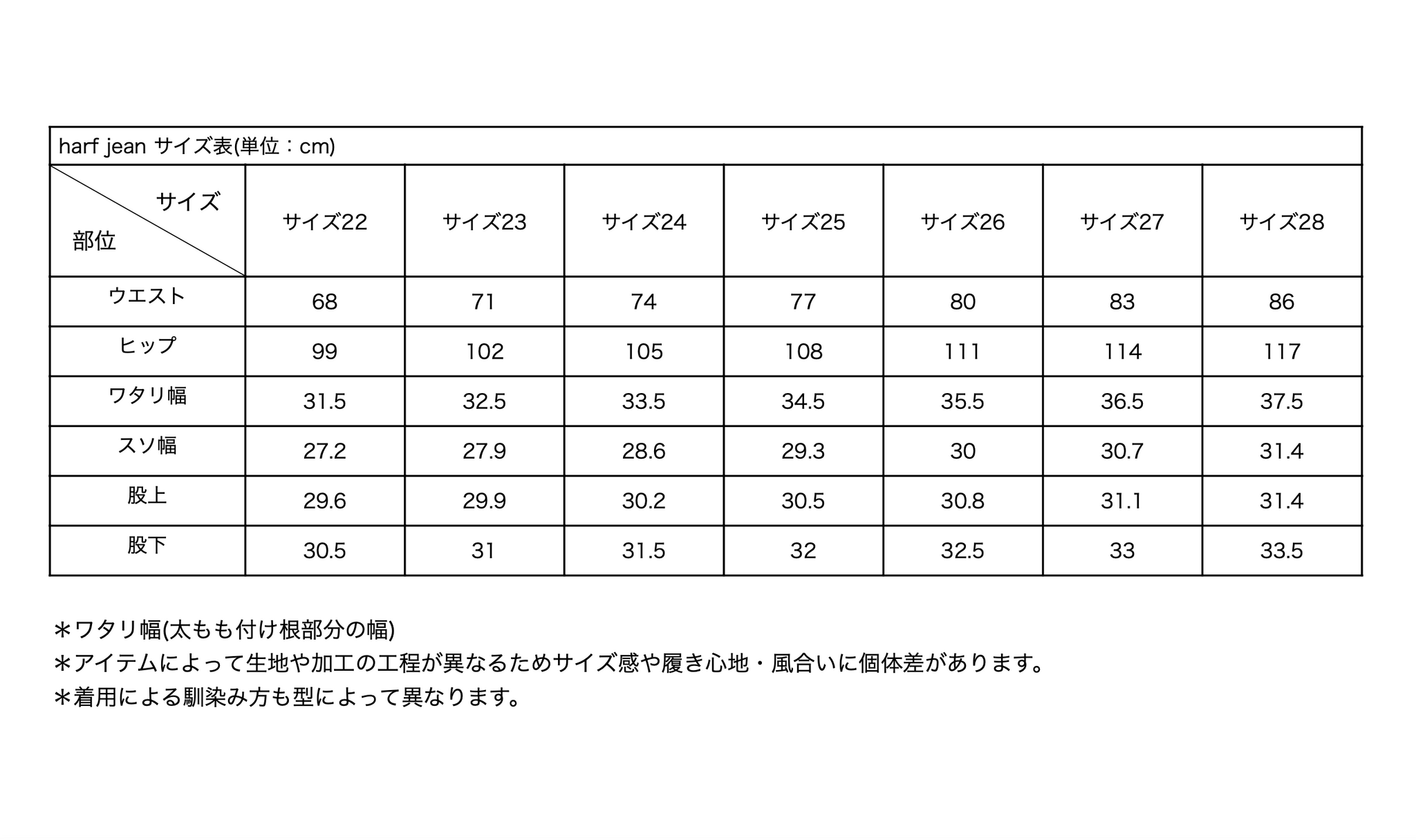 *アイテムによって生地や加工の工程が異なるため、サイズ感や履き心地、風合いに個体差があります。