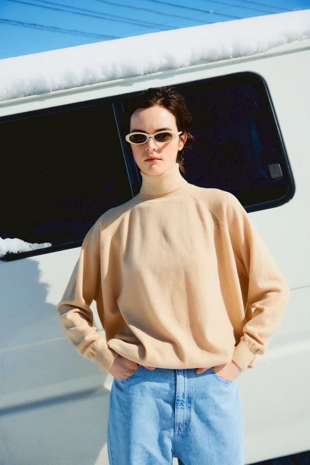オーバーサイズ、タートルネックニット。