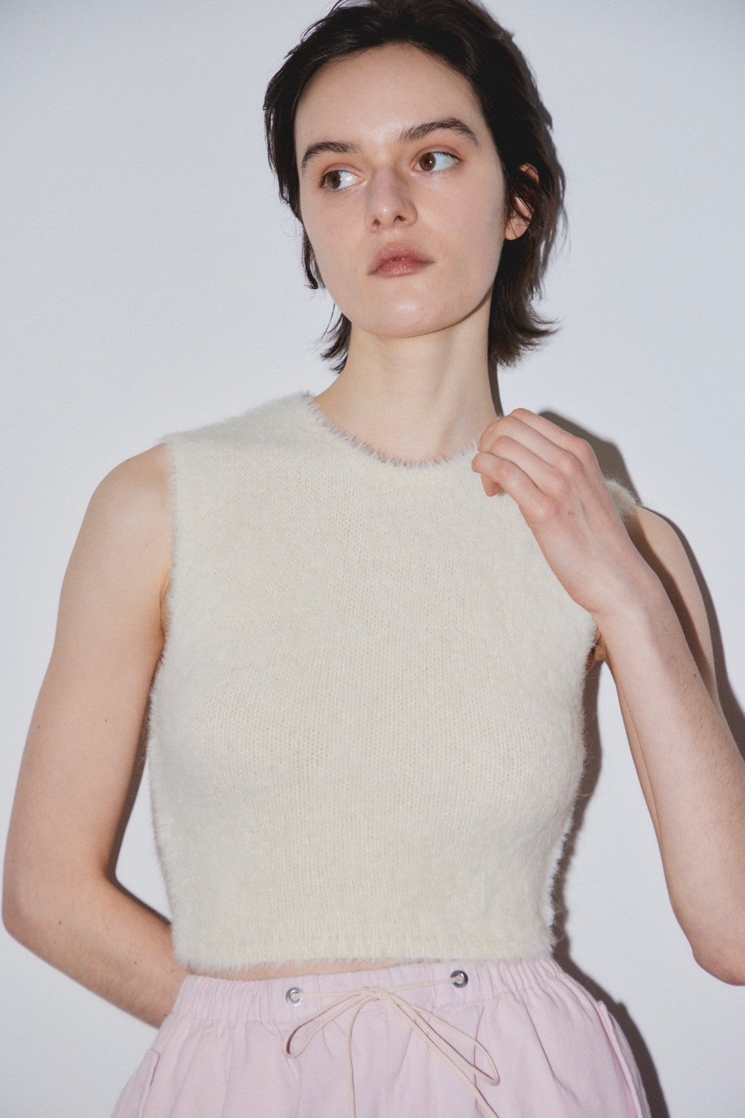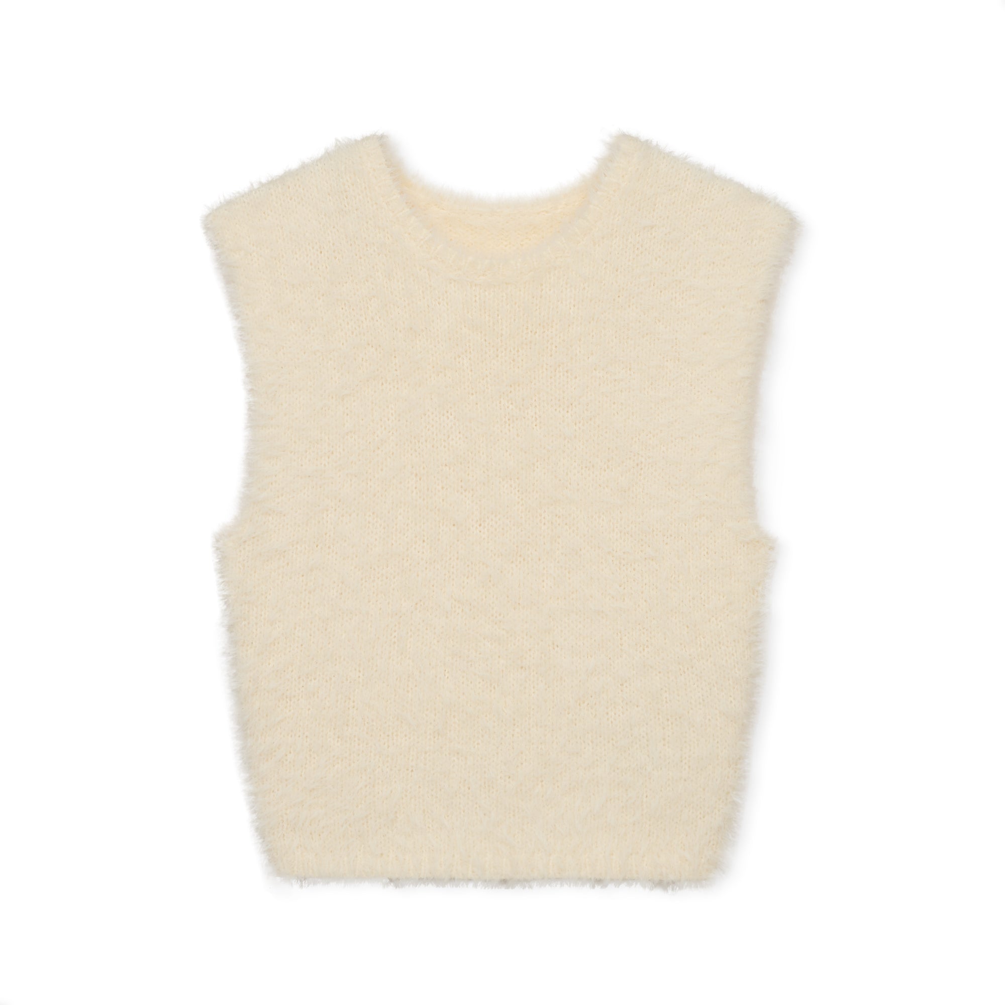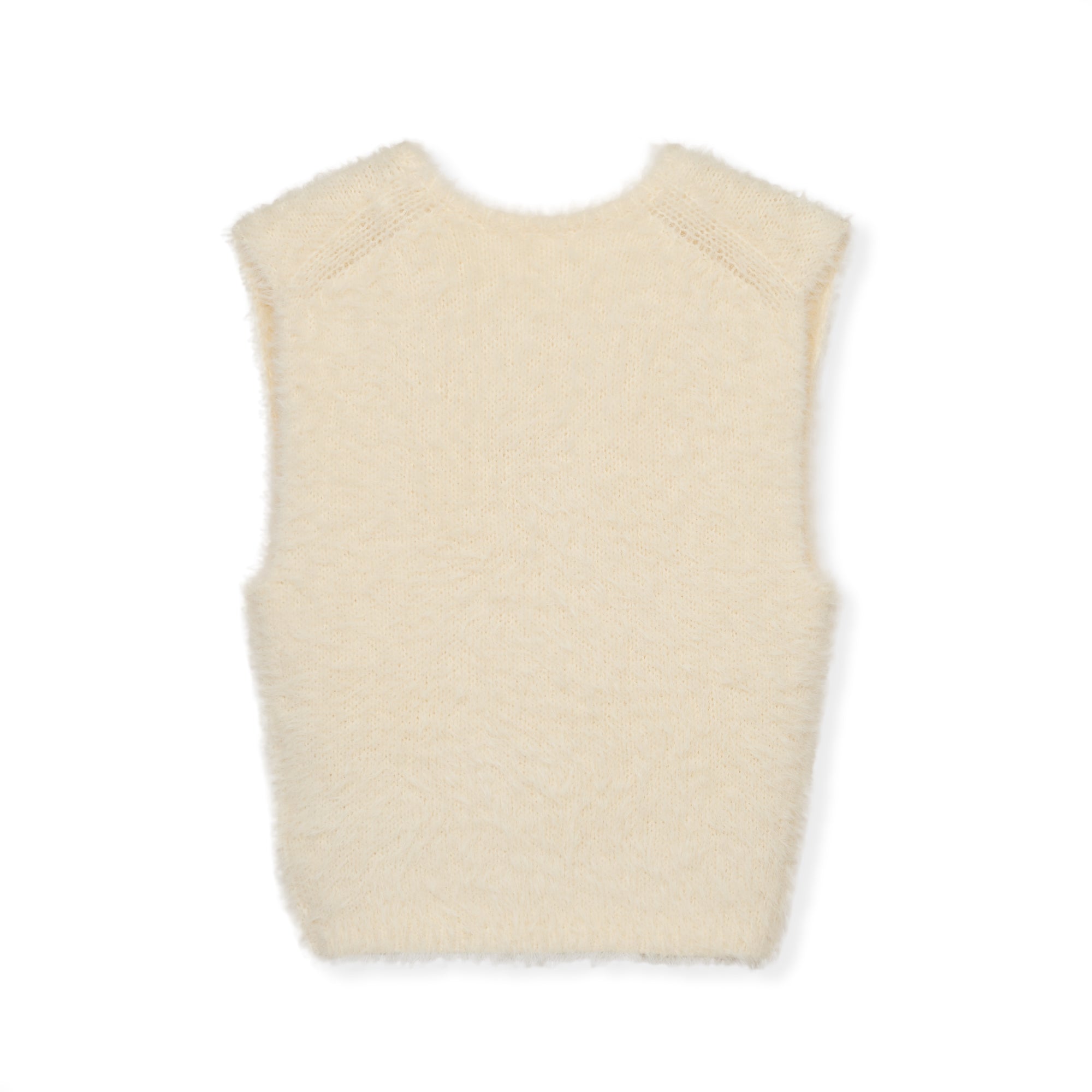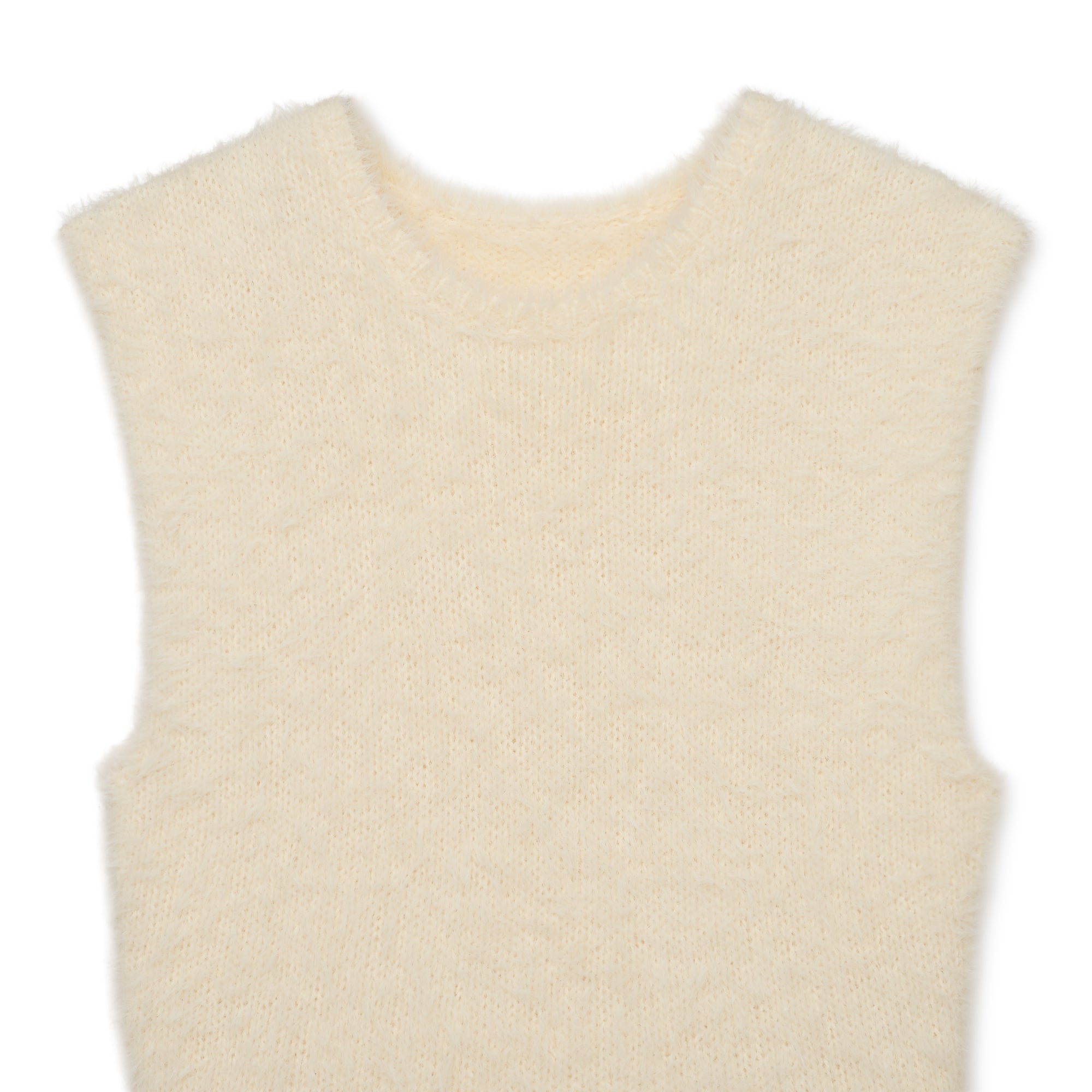 毛足の長いウールミックス糸を編み込んだノースリーブトップスです。