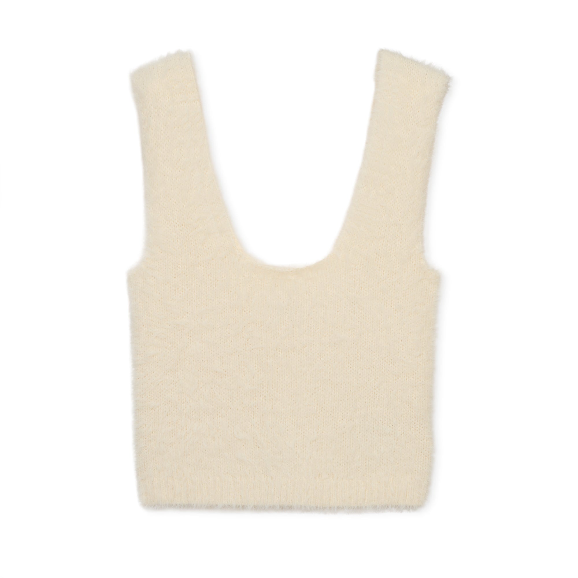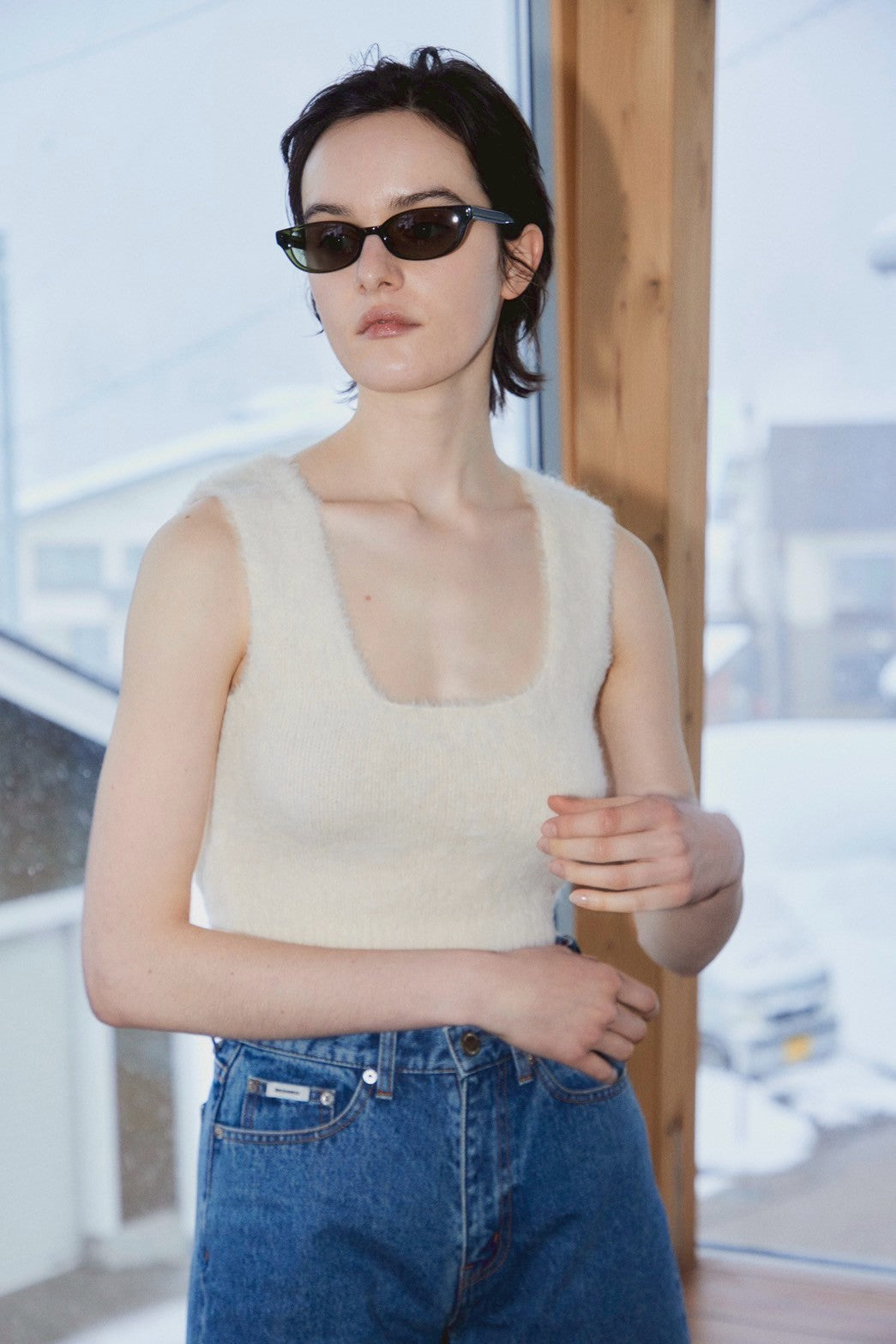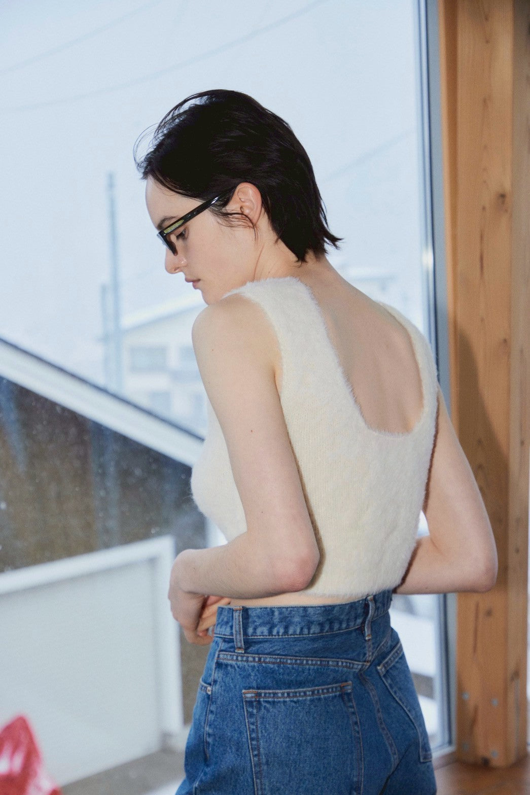 毛足の長いウールミックス糸を編み込んだスクエア型ノースリーブトップスです。