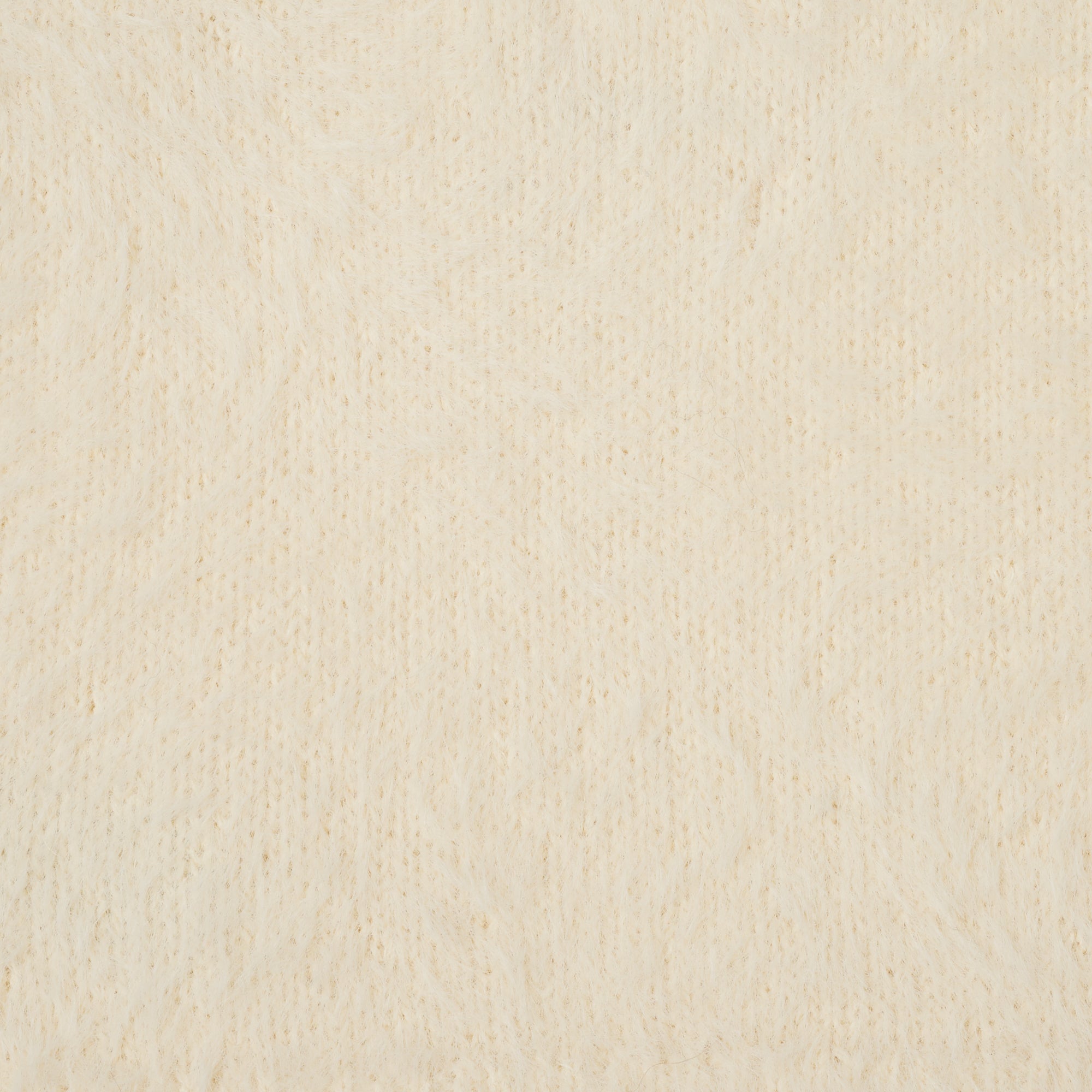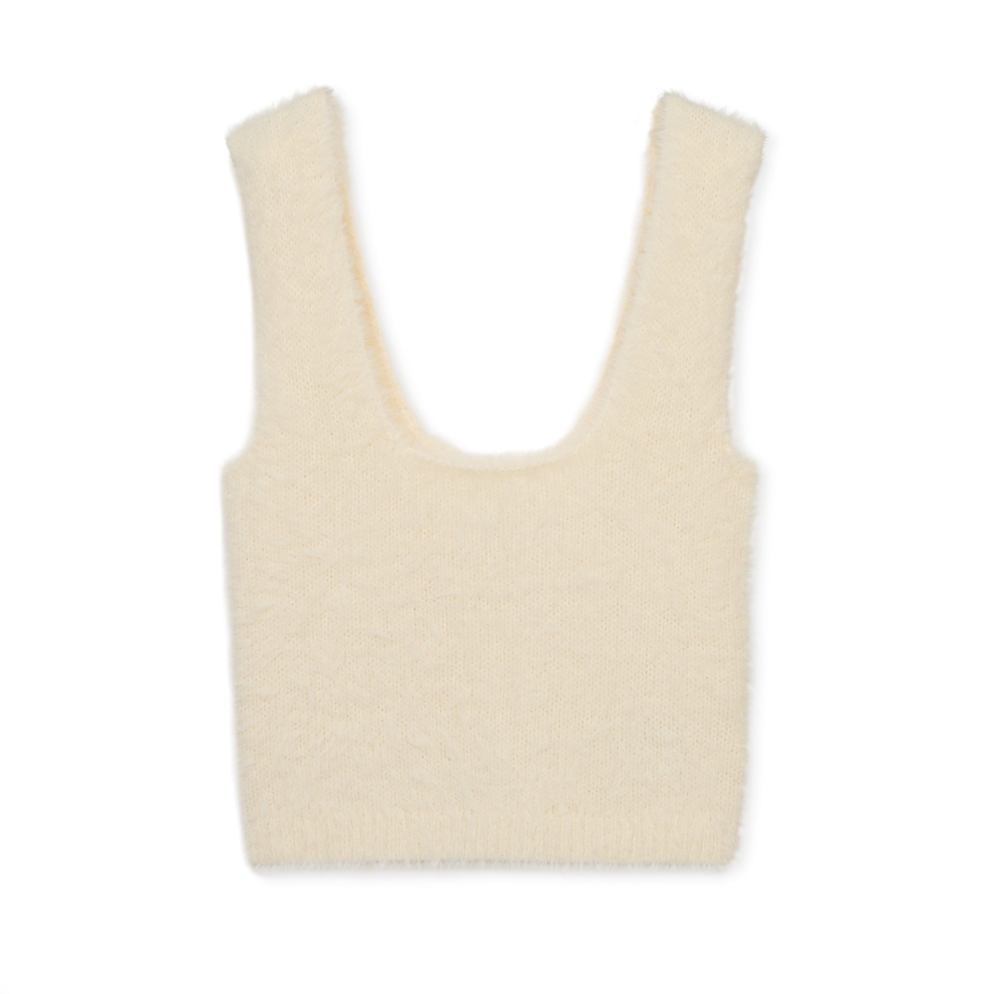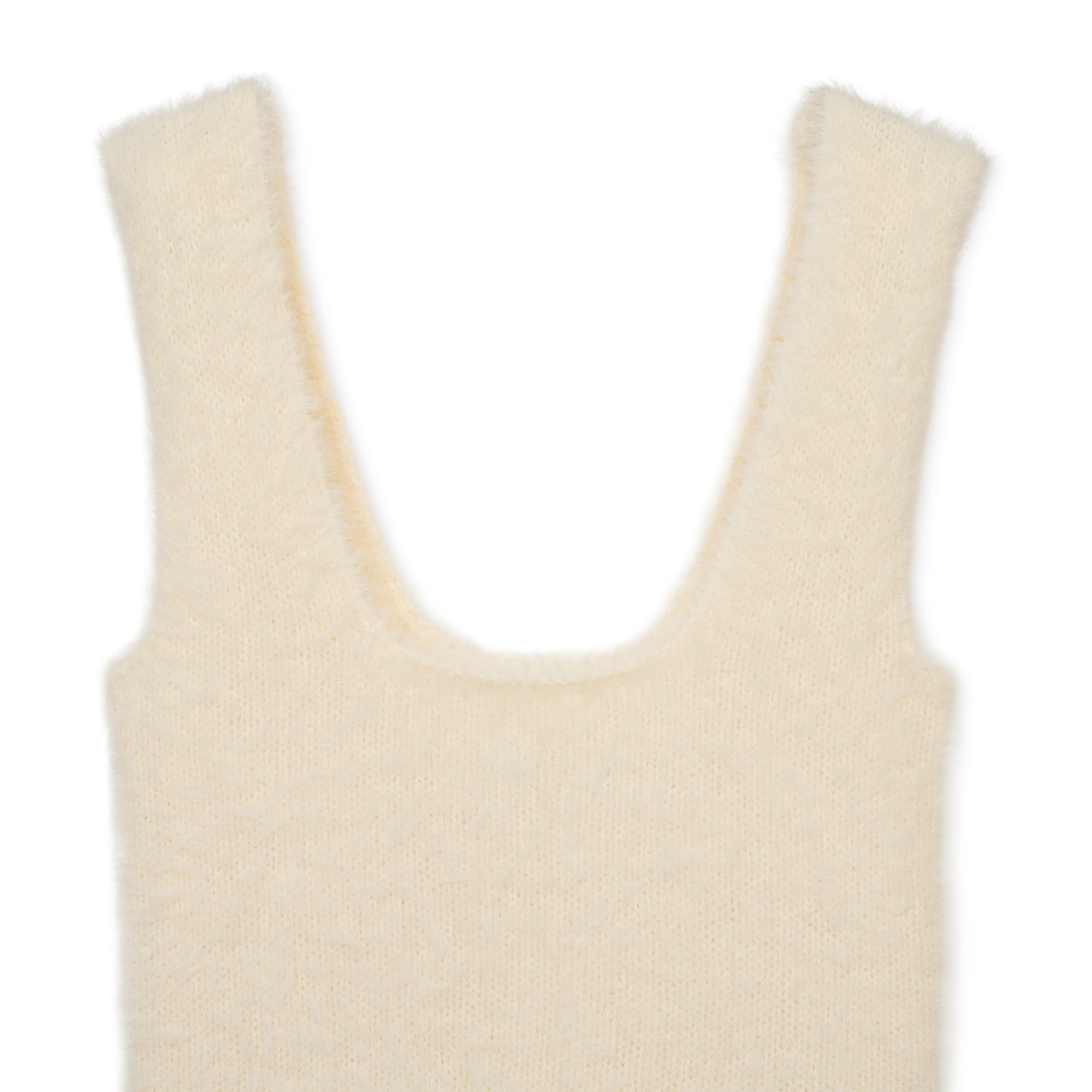 毛足の長いウールミックス糸を編み込んだスクエア型ノースリーブトップスです。